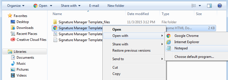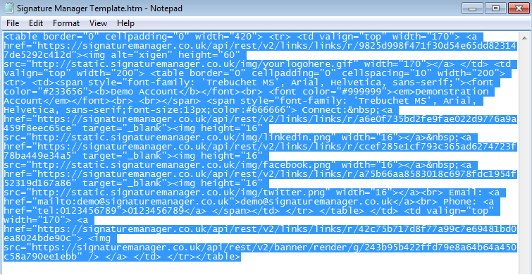 Open up the file browser and navigate to "%APPDATA%\Microsoft\Signatures" without quotes. There should be file called "Signature Manager Template.htm", open this in a program that can edit text files such as Notepad. If there is any code / text within this file it should be removed as it will be replaced later.